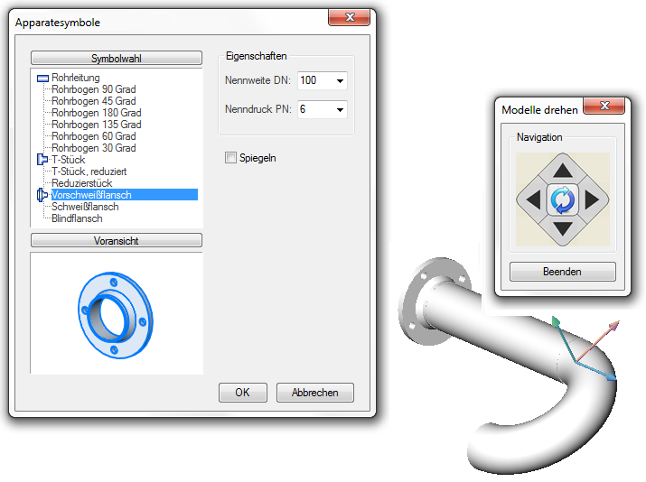 GDESIGN Mechanical stellt Ihnen die benötigten 2D Apparatesymbole in verschiedenen Ansichten zur Verfügung. Flansche und T-Stücke überblenden bestehende Rohrleitungen und können somit individuell ausgerichtet werden.
