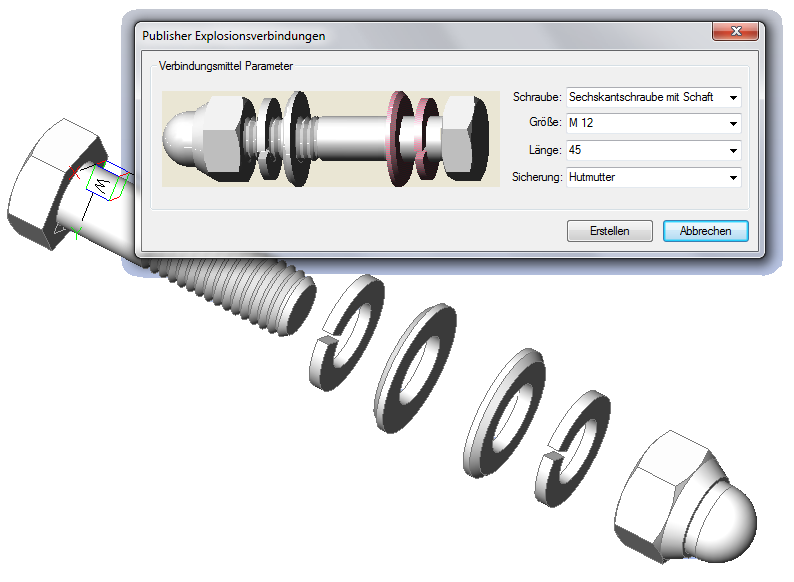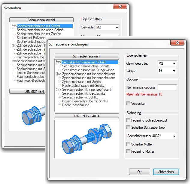 GDESIGN Mechanical erzeugt Schrauben, optional mit Schraubensicherungen. Bei der Generierung von Senkschrauben wird automatisch eine Senkung an einer vorhandenen Bohrung erzeugt. Sechskantschrauben oder Zylinderschrauben können ebenfalls mit einer entsprechenden Senkbohrung generiert werden. Es bleibt Ihnen überlassen ob Sie eine vereinfachte Darstellung der Schraube wählen oder ein Schraubengewinde generieren lassen.