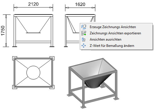 Erzeugte 3D Modelle müssen für die Fertigung als 2D Zeichnungsansichten abgeleitet werden. Leistungsfähige CAD-Programme wie BricsCAD erfüllen diese Aufgabe. Wir helfen Ihnen dabei durch | Ansichten ausrichten. Um die erstellten 2D Ansichten bemaßen zu können, verfügt unsere Software über die Funktionen Beschriftungsmodus und Z-Wert für Bemaßung ändern. Alternativ zum Papierbereich ermöglichen wir Ihnen somit auch im Modelbereich die Möglichkeit Zeichnungen für die Fertigung zu erstellen, zum besseren Verständnis, optional mit der erzeugten 3D Konstruktion.